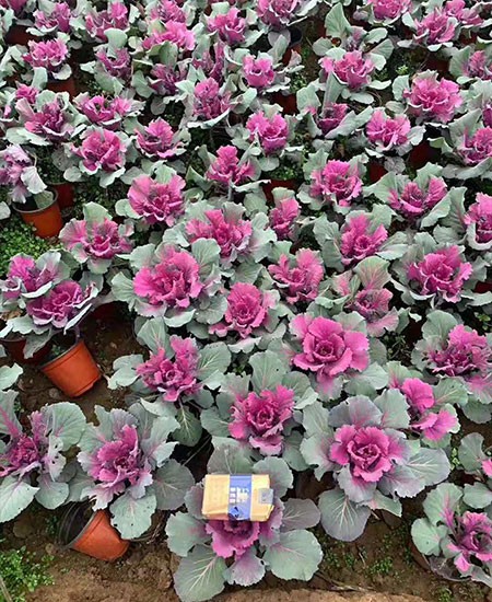 羽衣甘藍(學名:Brassica oleracea var. acephala DC.)是十字花科蕓苔屬植物,為二年生觀葉草本花卉,為甘藍的園藝變種。基生葉片緊密互生呈蓮座狀,葉片有光葉、皺葉、裂葉、波浪葉之分,葉脈和葉柄呈淺紫色,葉葉色豐富,有黃、白、粉紅、紅、玫瑰紅、紫紅、青灰、雜色等。葉片的觀賞期為12月至翌年3、4月份。株高一般為20-40厘米,總狀花序,花淺黃色。果實為角果,6月份種子成熟,種子黑褐色扁球形。 [1] 中國大城市公園有栽培。 [2] 喜冷涼氣候,適宜生長發(fā)育的適溫為20-25℃,耐寒,能忍受多次短暫的霜凍而不枯萎,抗高溫能力達35℃以上,轉色需有15℃左右的低溫刺激;喜陽光,對土壤的適應性很強。 [3] 葉片形態(tài)美觀多変,心葉色彩絢麗如花,整株酷似一朵盛開的牡丹花,人們形象地稱之為“葉牡丹”。又因其喜冷涼氣候,較耐寒,可忍受多次短暫的霜凍,在百花凋零的冬季和早春,是布置露地花壇、花臺及盆栽陳設美化用材。